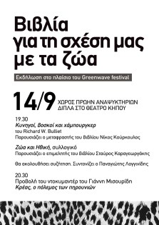 Την Παρασκευή 14/9 στο Greenwave festival θα γίνει ομιλία-συζήτηση με θέμα «Βιβλία για την σχέση μας με τα ζώα» και προβολή του ντοκυμαντέρ «Κρέας, ο πόλεμος των πηρουνιών»