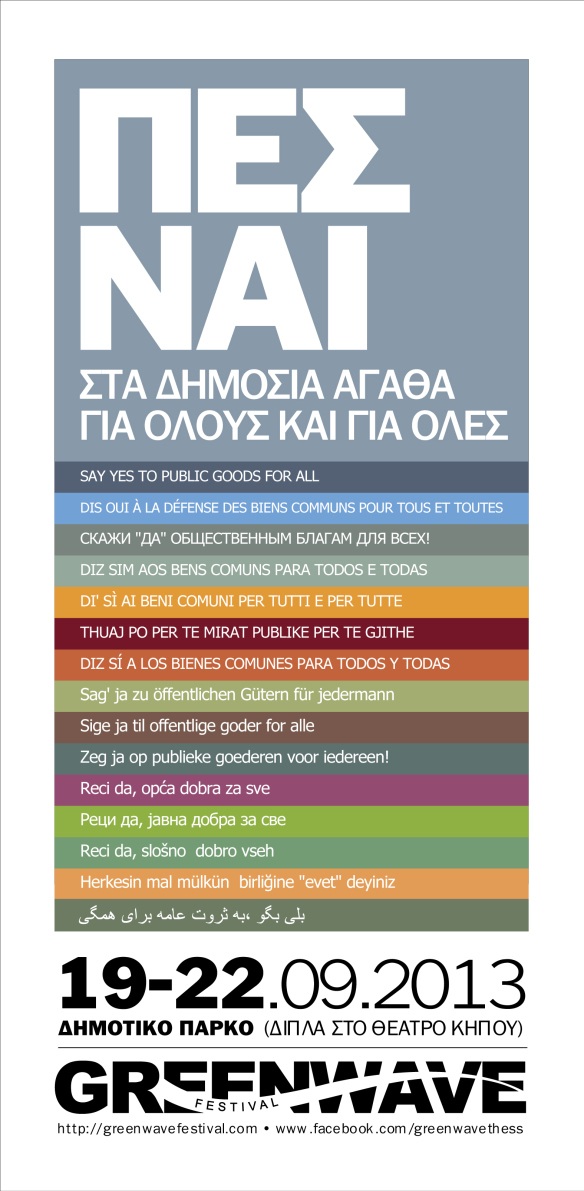 Έπεσε η αυλαία για το 3ο Greenwave festival και η οργανωτική επιτροπή επιθυμεί να ευχαριστήσει όλους και όλες εσάς που στηρίξατε αυτήν την προσπάθεια και συμβάλατε στην μεγάλη επιτυχία του Greenwave festival 2013, με μια γιορτή. Οι 4 ημέρες του φεστιβάλ και οι χιλιάδες κόσμου που το στήριξαν με την παρουσία τους μας γεμίζουν αισιοδοξία και δύναμη για τη συνέχεια. Γιατί ο αγώνας για την υπεράσπιση των δημόσιων αγαθών, της δημοκρατίας και του περιβάλλοντος είναι διαρκής και, σήμερα περισσότερο από ποτέ, αναγκαίος. Ελάτε να γιορτάσουμε μαζί κλείνοντας αυτόν τον κύκλο και εγκαινιάζοντας ένα νέο ο οποίος θα χωράει όλο και περισσότερους ανθρώπους σε μια κοινή συστράτευση στον καθημερινό πια αγώνα για την υπεράσπιση της ίδιας της ζωής!